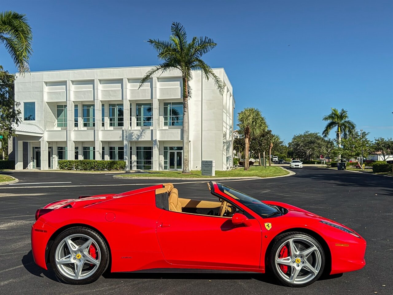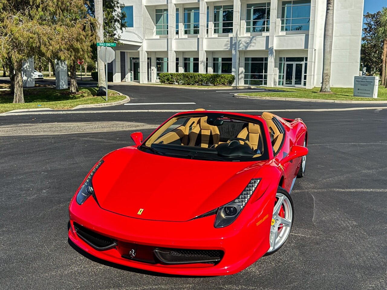 2014 Ferrari 458 Spider. Corsa Exterior with Beige Leather Interior w/ Blue Alcantara Inserts Interior. Features Include: 562 Horsepower 4.5L V8 Engine, 7 Speed Dual Clutch Transmission, 20" 5-Spoke Wheels in Silver, Red Brake Calipers, Carbon Ceramic Brakes, Carbon Fiber Front Bumper Inserts, Carbon Fiber Rear Diffuser, Scuderia Shields, Powering Folding Mirrors, Parking Camera, Carbon Fiber Dash Inserts, Carbon Fiber Steering Wheel w/ L.E.D. Shift Lights, Carbon Fiber Shift Paddles, Carbon Fiber Gauge Surround, Carbon Fiber Central Bridge, Carbon Fiber B Pillars, Tan Leather Headliner, Full Electric Seats, Leather and Alcantara Interior, Horse Stitched On Headrests, Black Deviated Stitching, Full Optional Mirrors with Homelink, Satellite Radio, Navigation, Bluetooth. Priced at only $229,995.00. Financing available. We ship worldwide. We pay top dollar for lightly used sports cars! Call or text our Product Specialists today at 239-522-2262 or email us at sales@gcmworks.com.