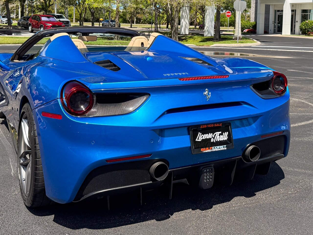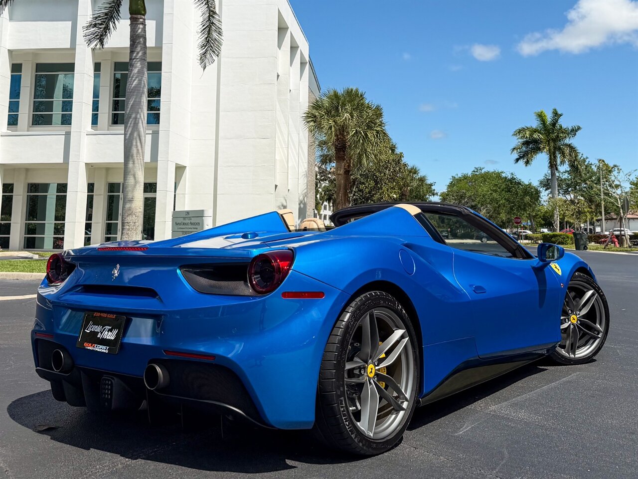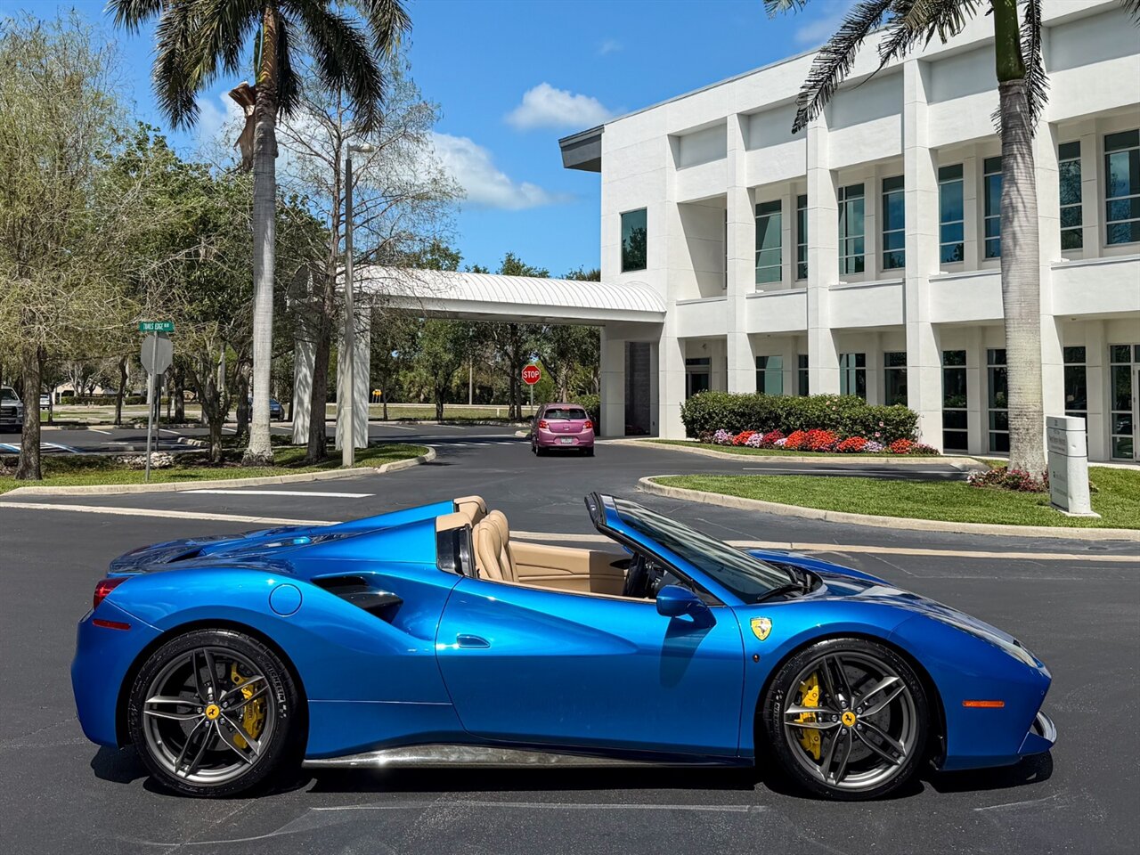 2017 Ferrari 488 Spider. Blu Corsa Exterior with Crema Leather Interior. Features Include: 800 Horsepower Twin Turbo 3.9L V8 Engine, Seven-Speed Dual Clutch Automatic Transmission, Magnetic Suspension Damping, 21" Front 22" Rear Wheels in Silver, Carbon Ceramic Brakes, Yellow Brake Calipers, 'Scuderia Ferrari' Shields, Fabspeed Downpipes, Fabspeed Tune, Pure Turbos, Novitec Suspension, Carbon Fiber Rear Air-Ducts, Carbon Fiber Side Air Splitter, Power Folding Convertible Hard Top, Projector Beam AFS Headlights, LED DRLs, LED Tail Lights, Front & Rear Parking Sensors, Parking Camera, Power Folding Outside Mirrors, Keyless Access & Start, Yellow Rev. Counter, Instrument Cluster with Two TFT Screens, Carbon Fiber Central Bridge, Colored Safety Belts, Daytona Style Seats, Colored Upper Dashboard, Electric Seats, Cavallino Stitched On Headrest, Carbon Fiber Steering Wheel + LEDS, Inner Color Rear Leather Trim, Leather Perforated, Colored Steering Wheel,Selectable Drive Modes, Dual Zone Automatic Climate Control, Smartphone Integration, Bluetooth, Navigation, HomeLink. Priced at only $289,995.00. Financing available. We ship worldwide. We pay top dollar for lightly used sports cars! Call or text our Product Specialists today at 239-522-2262 or email us at sales@gcmworks.com. Fees and Taxes: $1199.00 Doc Fee on all Purchases. Out of state buyers are responsible for all state, county, city taxes and fees, as well as title/registration fees in the state that the vehicle will be registered.