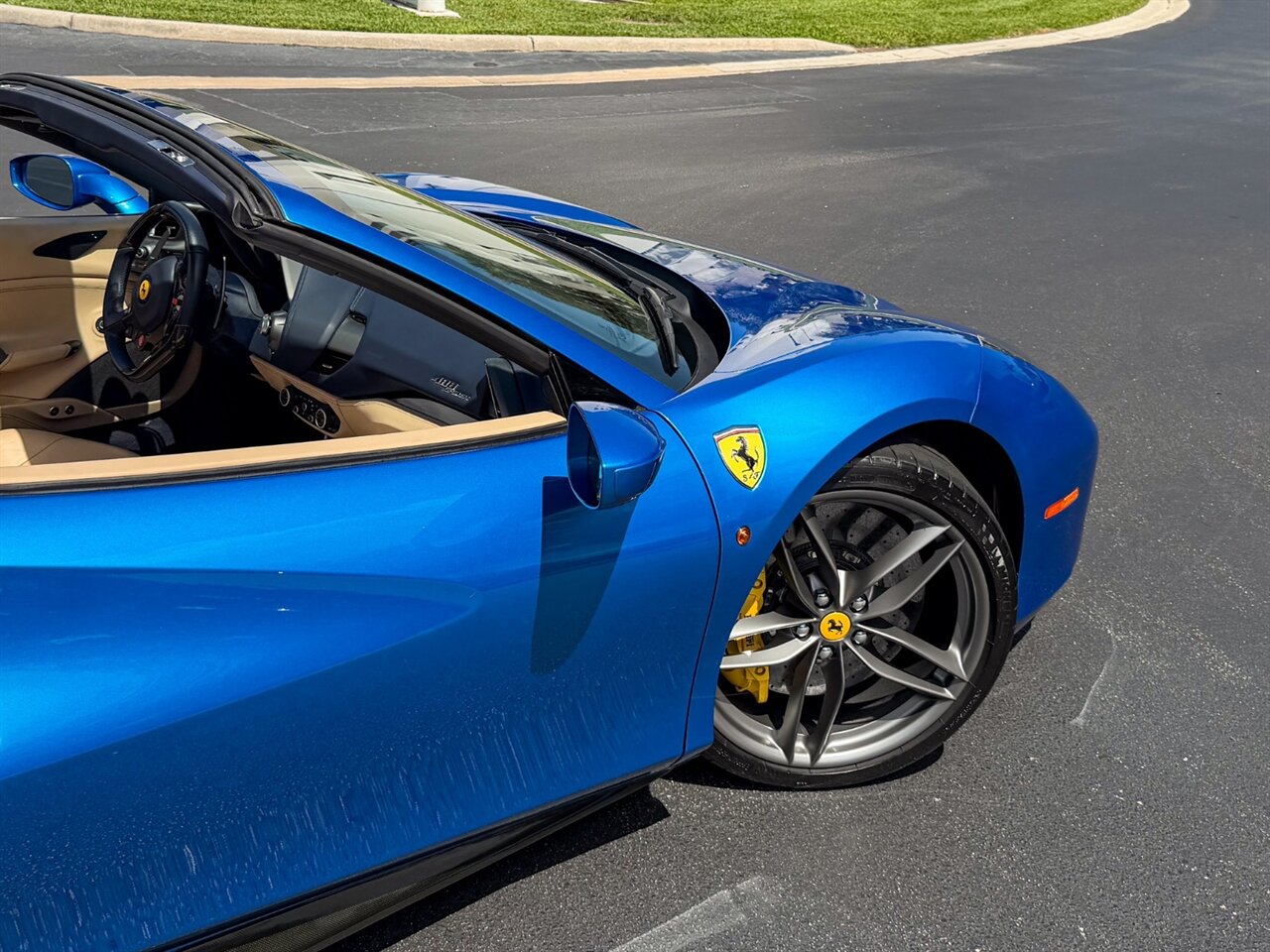 Blu Corsa Exterior with Crema Leather Interior. Only 9,645 Miles! Power Retractable Hard Top, 'Scuderia Ferrari' Shields, 21" Front 22" Rear Wheels in Silver,