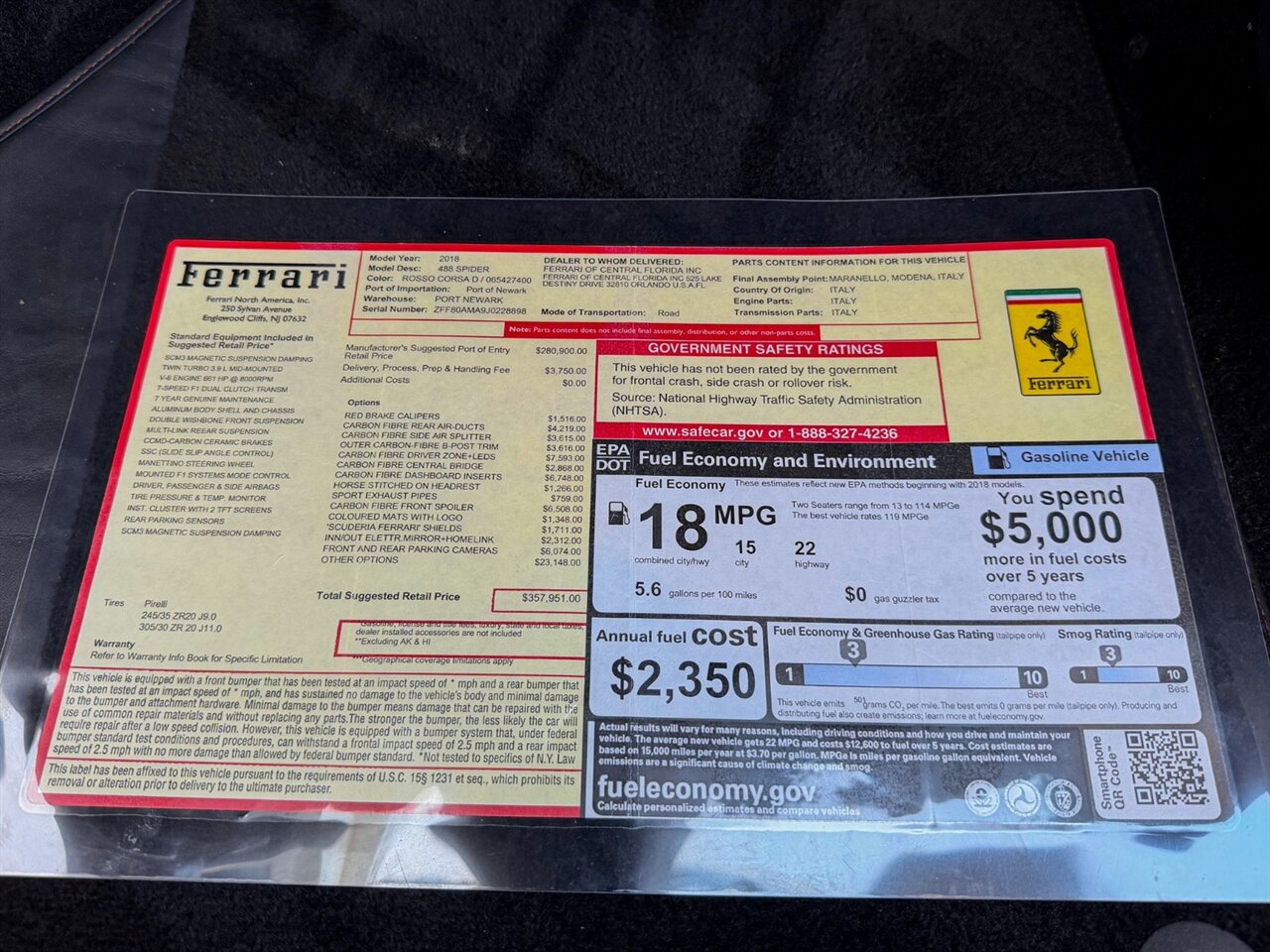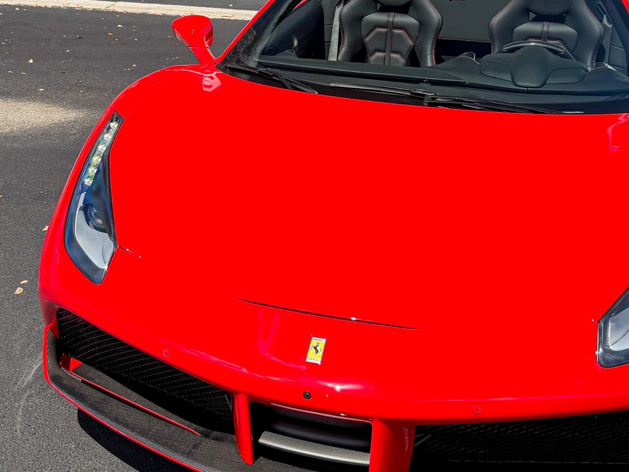 2018 Ferrari 488 Spider. Rosso Corsa Exterior with Nero Leather Interior. Features Include: 661 Horsepower Twin Turbo 3.9L V8 Engine, Seven-Speed Dual Clutch Automatic Transmission, Magnetic Suspension Damping, 20" 5-Split-Spoke Wheels in a Dark Silver, Carbon Ceramic Brakes with Red Calipers, Carbon Fiber Rear Air Ducts, Carbon Fiber Side Air Splitter, Outer Carbon Fiber B-Post Trim, Sport Exhaust System, Carbon Fiber Front Spoiler, Scuderia Ferrari Shields, Power Folding Convertible Hard Top, Projector Beam AFS Headlights, LED DRLs, LED Tail Lights, Front & Rear Parking Sensors, Parking Camera, Power Folding Outside Mirrors, Keyless Access & Start, Selectable Drive Modes, Leather Wrapped Steering Wheel, Carbon Fiber Steering Wheel Trim, Carbon Fiber Driver Zones+ LEDS, Carbon Fiber Central Bridge, Dash Inserts in Carbon Fiber, Cavallino Stitched on Headrest, Colored Mats with Logo, Red Rev Counter, Goldrake Racing Seats, Colored Special Stitching, Dual Zone Automatic Climate Control, Smartphone Integration, JBL HiFi Sound System, Bluetooth, Navigation, HomeLink. Priced at only $339,995.00. Financing available. We ship worldwide. We pay top dollar for lightly used sports cars! Call or text our Product Specialists today at 239-522-2262 or email us at sales@gcmworks.com. Fees and Taxes: $1199.00 Doc Fee on all Purchases. Out of state buyers are responsible for all state, county, city taxes and fees, as well as title/registration fees in the state that the vehicle will be registered.