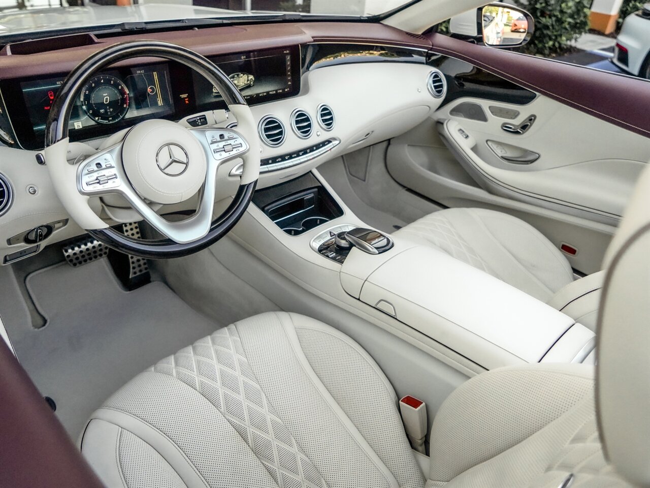 designo Diamond White Metallic Exterior with designo Porcelain/Titan Red Exclusive Nappa Leather Interior. Only 7,400 Miles! Sport Package, Premium Package, Driver Assistance Package, Burmester Audio.