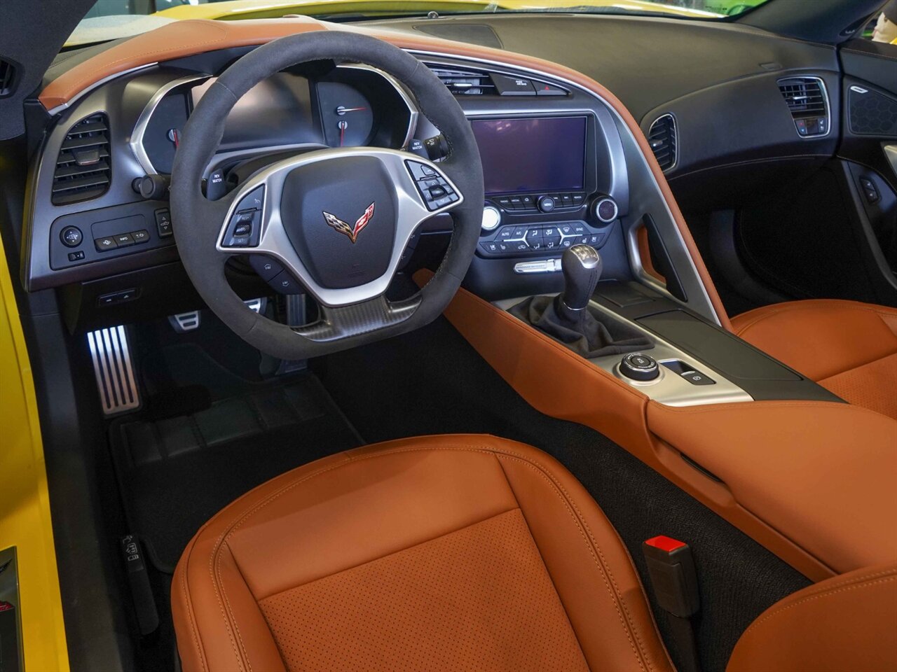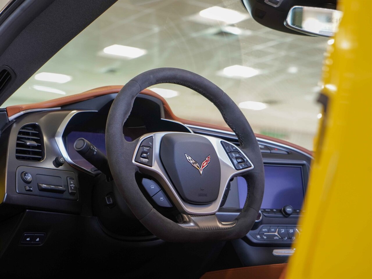 Corvette Racing Yellow Exterior with Kalahari Leather Interior. Grand Sport Aluminum Wheels, 2LT Equipment Group, Sueded Microfiber Steering Wheel, Yellow Brake Calipers, 7-Speed Manual Transmission.