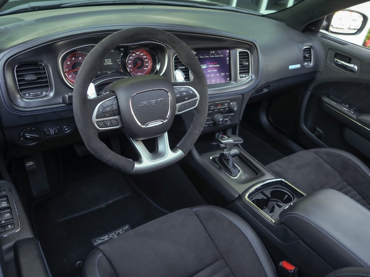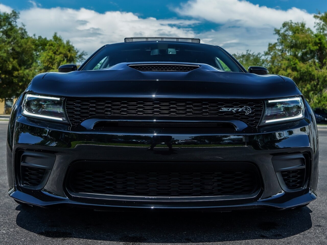 Pitch Black Clear Coat Exterior with Black Leather Interior. Only 438 Miles! SRT Configurable Drive Modes, Line Lock Launch Control, Harmon Kardon Surround Sound System.