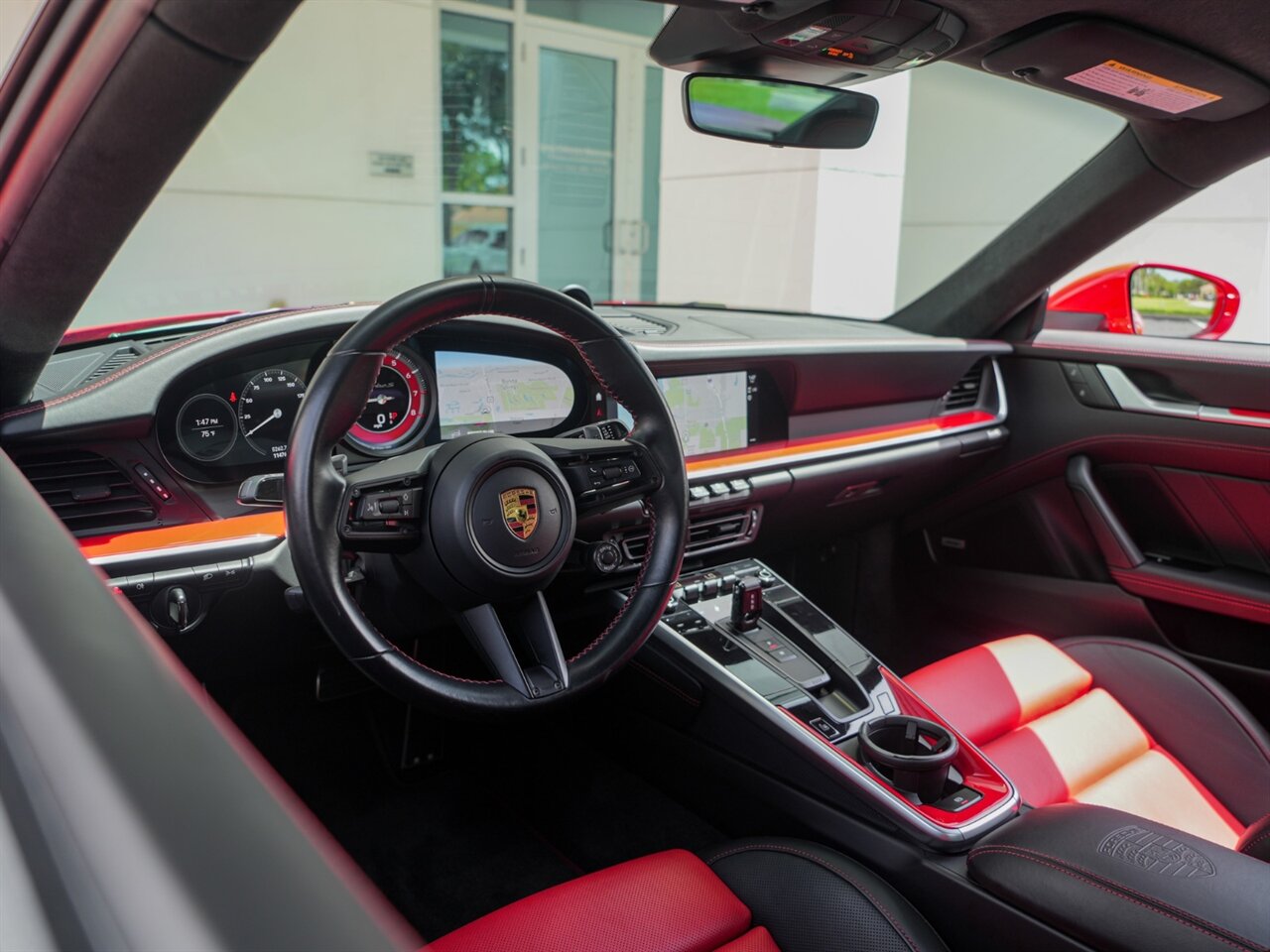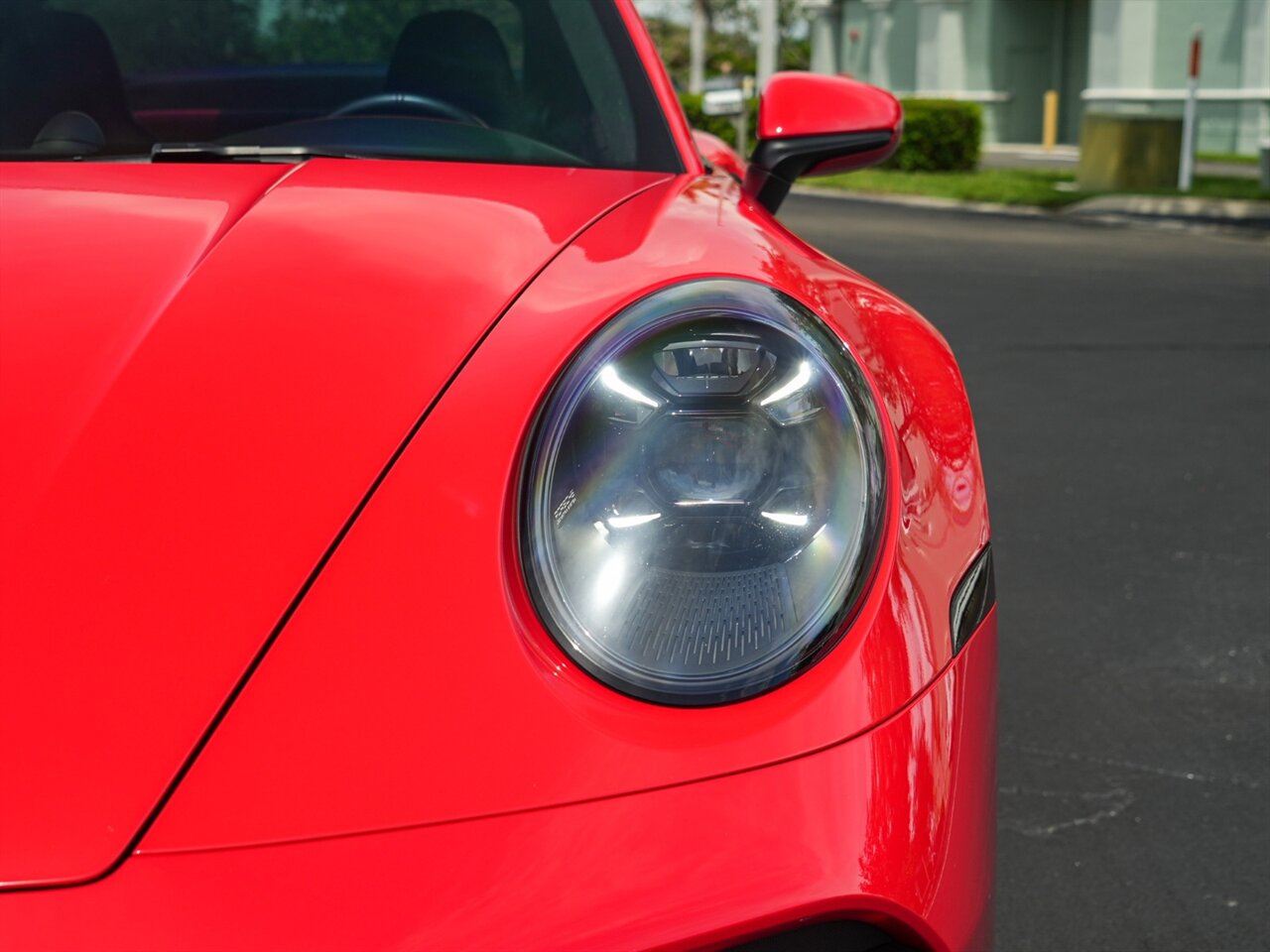 Guards Red Exterior w/Red & Black Interior. Only 11,476 Miles. Carbon Fiber Roof, Brake Calipers in Yellow, Turbo Sportdesign Package,Heated GT Sport Steering Wheel, Bose Audio.