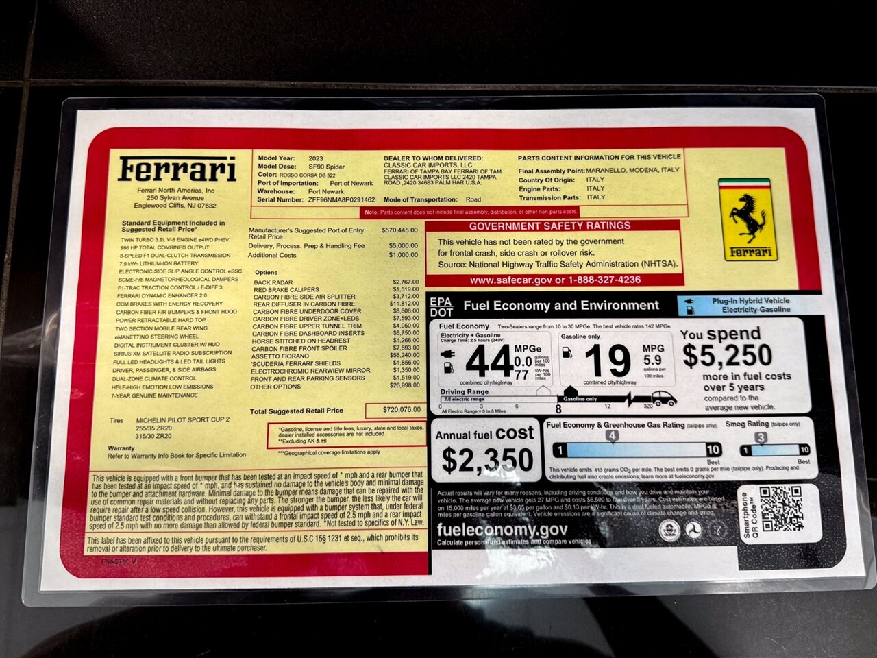2024 Ferrari SF90 Spider. Rosso Corsa Exterior with Rosso Interior. Features Include: 986 Horsepower Combined Output Twin Turbo 3.9L V8 Engine e4WD PHEV, 7.9 kWh Lithium Ion Battery, Eight-Speed F1 Dual-Clutch Automatic Transmission, F1-TRAC Traction Control/E-Diff 3, SCME-FrS Magnetorheological Dampers, 20" Diamond Polished, Forged Wheels, CCM-Carbon Ceramic Brake System, Red Brake Calipers, 'Scuderia Ferrari' Shields, Back Radar, Carbon Fiber Side Air Splitter, Rear Diffuser In Carbon Fiber, Carbon Fiber front Spoiler, $56,240 Asseto Fiorano Package, Full LED Headlights, LED Tail Lights, LED DRLs, Front & Rear Parking Sensors, Rear Parking Camera, Advanced Front Driving Camera, Keyless Access & Ignition with Push To Start, Carbon Fiber Driver Zone + LEDs, Carbon Fiber Under Door Covers, Carbon Fiber Upper Tunnel Trim, Carbon Fiber Dashboard Inserts, Horse Stitched on Headrest, Leather Wrapped Multi-functioning Steering Wheel, Black Interior Inserts, SiriusXM Radio Capable, Smartphone Integration, Bluetooth Phone & Audio, Navigation, Dual Zone Automatic Climate Control. Priced at Only $599,995. Financing and leasing available. We ship worldwide. We pay top dollar for lightly used sports cars, Call or text Our Product Specialists today at 239-522-2262 or email at sales@gcmworks.com. Fees and Taxes: $1199.00 Doc Fee on all Purchases. Out of state buyers are responsible for all state, county, city taxes and fees, as well as title/registration fees in the state that the vehicle will be registered.